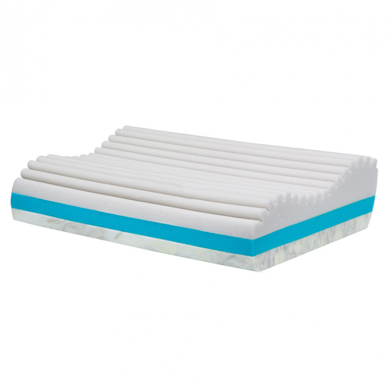 - верхний слой с «эффектом памяти» и валиками различной высоты обеспечивает правильное положение головы и шеи, дарит ощущение невесомости, не препятствует воздухообмену